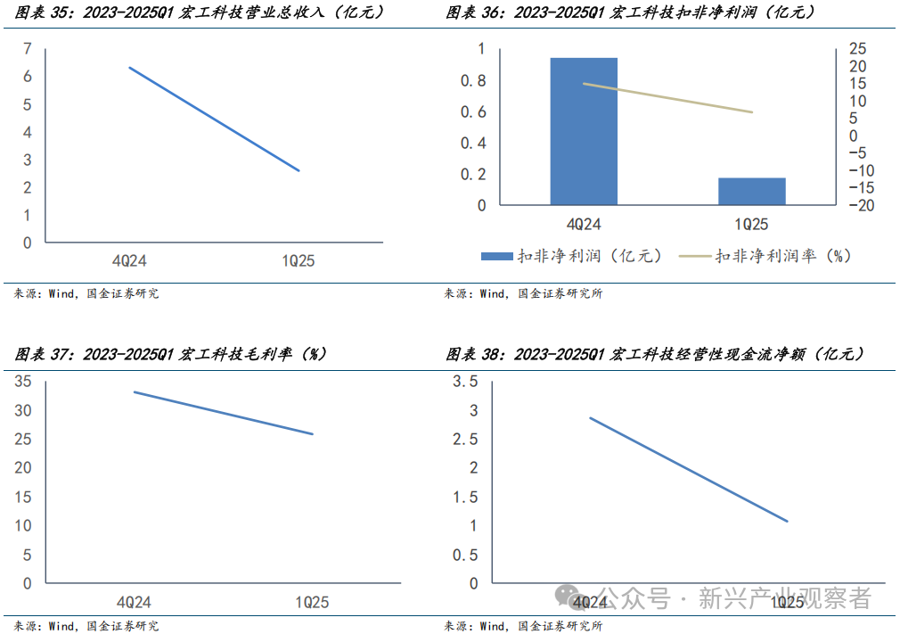 宏工科技营收盈利短期下滑,现金流稳健,在手订单波动但年初新签向好。2024年Q4营收6.3亿元、扣非净利润0.9亿元,2025年Q1营收降至2.6亿元、扣非净利润0.2亿元,主因订单验收延迟。毛利率从33.1%降至25.8%,净利率从15%降至7%。两季度经营现金流均为正,2025年Q1为1.1亿元得益于回款增加、薪酬支出减少。2021年、2022年、2023年及2024年1~9月,宏工科技在手订单金额分别为22.6亿元、38.5亿元、28.6亿元及24.8亿元,在手订单波动较大且2023年末以来出现下滑。2025年以来,公司新签订单情况良好,2025年1~2月,新签订单金额约为人民币6.9亿元。