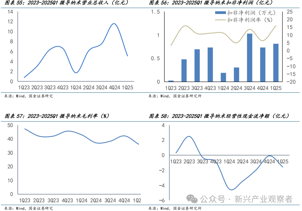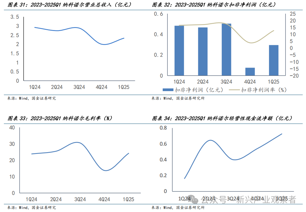 纳科诺尔营收与盈利经历短期波动后快速回升,毛利率逐步修复且现金流持续向好,在手订单为经营提供有力支撑。2024年Q1至Q3营收稳定在2.7亿至2.9亿之间,2024年Q4降至2亿,2025年Q1回升至2.3亿。2024年Q1至Q3扣非净利润稳定在0.5亿元附近,扣非净利润率维持17%左右;2024年Q4扣非净利润降至0.08亿,净利率降至4%,2025年Q1恢复至0.3亿,净利率回升至13%。毛利率2024年Q1至Q3从23.8%升至30.5%,2024年Q4因交付低毛利测试设备降至13.7%,2025年Q1回升至24.2%。经营活动现金流净额各季度均为正值且持续增长,从2024年Q1的0.2亿增至2025年Q1的0.7亿,现金创造能力较强,销售回款情况良好。2023年7月底,公司在手订单金额合计 23.9亿元。