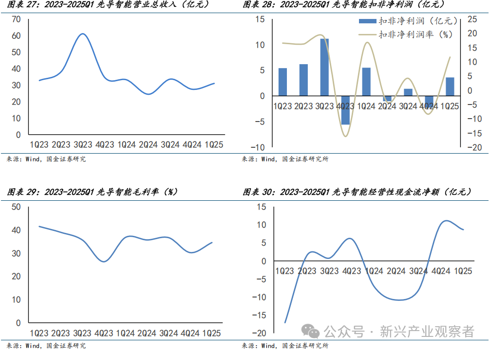 先导智能成本压力缓解且现金流回款改善,新签订单触底反弹并提升海外占比。公司2025年Q1营业收入同比微降6.4%,主因锂电/光伏设备需求低迷,订单验收节奏放缓。扣非净利润2023Q4及2024年多季度出现亏损,2025Q1回升至3.6亿元,扣非净利润率2025Q1回升至12%。公司毛利率从2023Q1的41.5%降至2024Q4的30.2%,2025Q1小幅回升至34.5%,成本压力边际缓解。现金流前期受存货及应收款占用拖累持续净流出,2025Q1净流入8.6亿元,回款节奏边际改善。