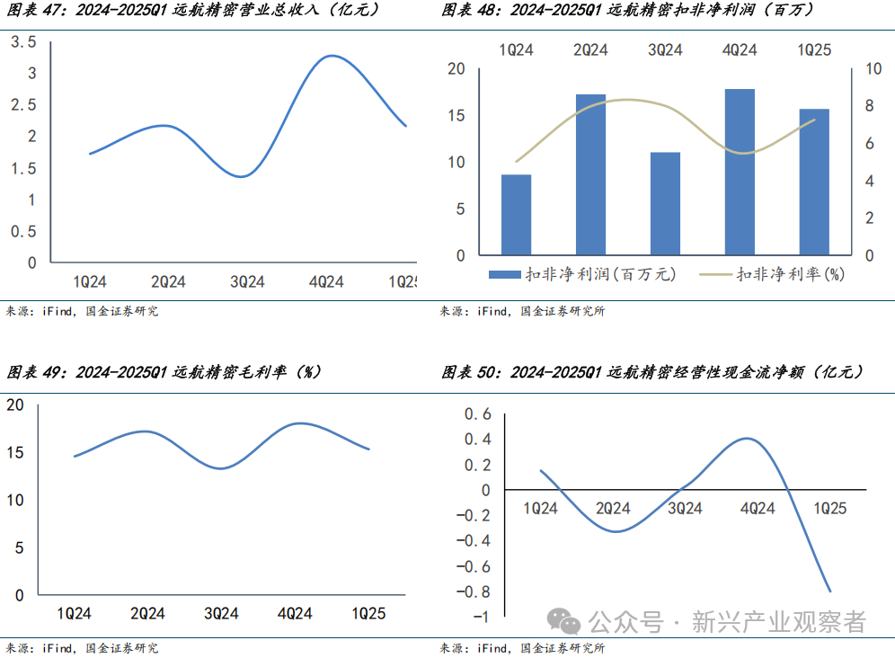 远航精密获利稳定,新签订单提升,需求强劲。公司2025年Q1营业收入同比增长25.6%,主因新能源、储能需求拉动销量增加。扣非净利润自2024Q1保持正向并持续向好,2025Q1增长至0.2亿元,扣非净利润率7.2%。公司毛利率从2024Q1大致在13%至18%间,2025Q1回落至15.3%,总体稳定。现金流2024全年整体改善,但2025Q1受存货及应收款占用拖累净流出0.8亿元,回款节奏边际恶化。2024年公司订单受制于下游需求调整和产能扩张节奏,2025Q1因下游新能源和消费电子需求复苏,下游需求强劲,新能源汽车渗透率提升和储能市场扩张推动订单稳健。