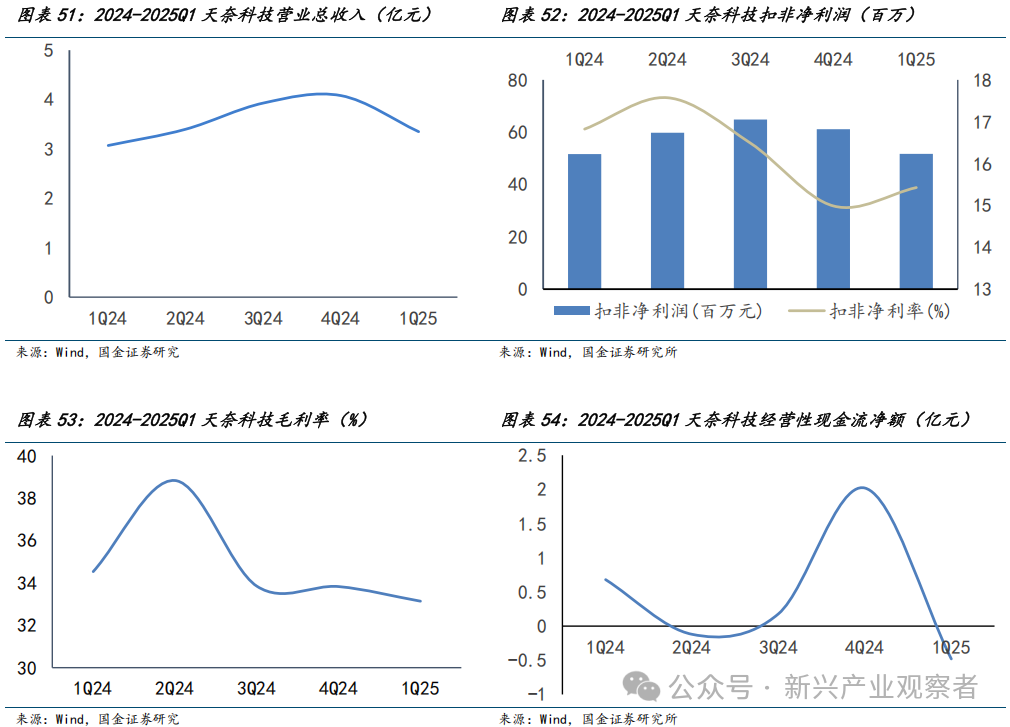 天奈科技净利回升,新签订单同比增长并提升海外占比。公司2025年Q1营业收入同比微增9.1%,主因电池领域碳纳米管需求增加,带动整体销量。扣非净利润2024Q1至今整体稳定,2025Q1小幅跌落至0.5亿元,扣非净利润率2025Q1回升至15.4%。公司毛利率自3Q24起基本维持稳定在33%。2024整体现金流转正,2024Q4升至2.02亿元,2025Q1由于出货量增长推高原材料采购需求,使现金流净流出0.5亿元。2024全年订单整体上行,前三季度出货量同比增长超40%。2025Q1出货量达1.9万吨,同比增长28%,一代产品占比降至42%~43%,二代、三代及单壁产品订单显著增加。