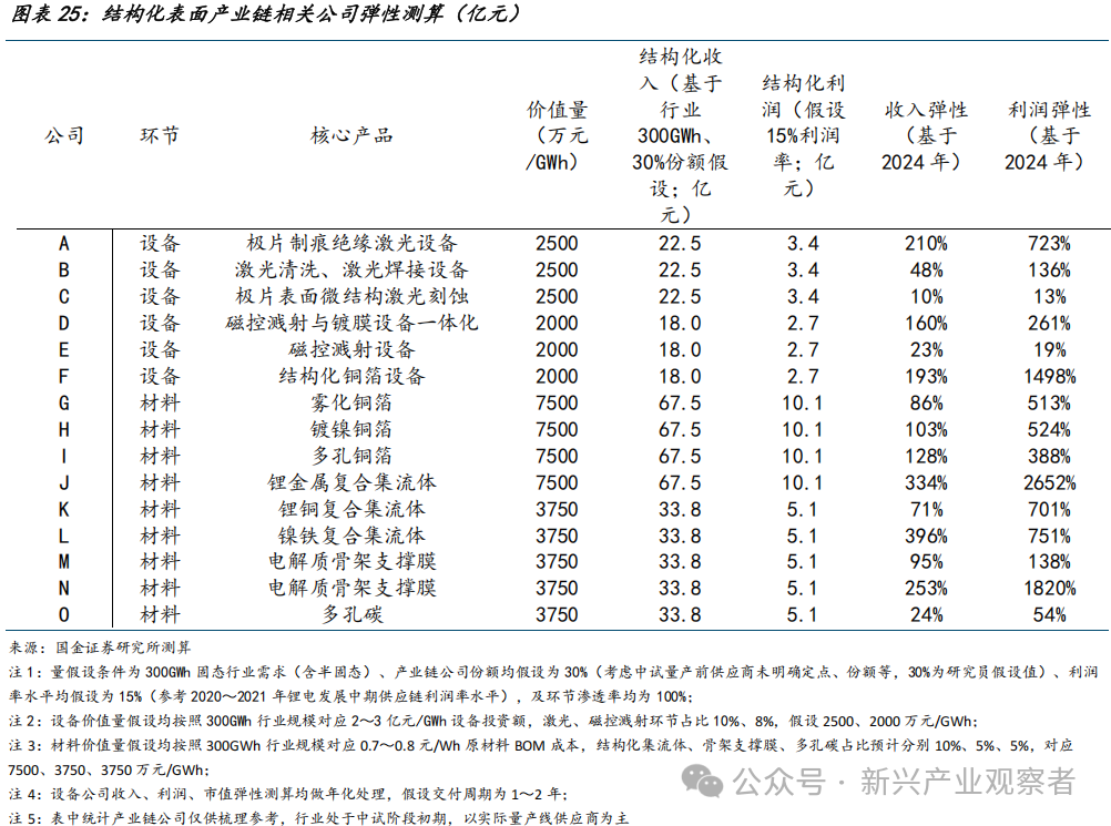 结构化表面环节产业链布局公司&弹性测算:设备端以德龙激光、联赢激光、大族激光、东威科技、振华科技,及三孚新科为代表,推动激光设备、磁控溅射,及结构化集流体设备等在固态领域应用;材料端德福科技、嘉元科技、诺德股份(维权)、英联股份、中一科技、远航精密、星源材质、长阳科技,及贝特瑞等有望加速结构化表面新材料在固态导入。GGII预测2035年固态电池需求总量为300GWh(含半固态),考虑到固态电池设备及材料壁垒较高,测算假设设备及材料供应商份额为30%、利润率为15%,产业链公司收入弹性为10%~396%,及利润弹性为13%~2652%。