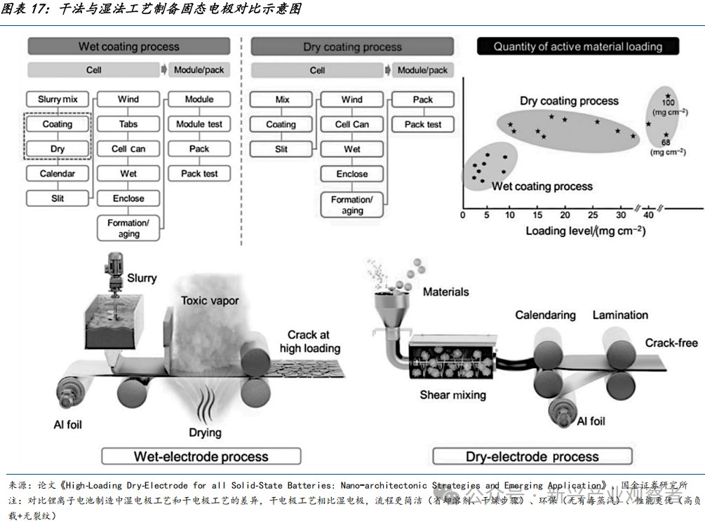 干法工艺为厚电极核心解决方案。厚电极在固态电池中可容纳更多的活性物质,适配固态电池的离子传输需求。湿法工艺不能制备厚电极的根本原因是溶剂蒸发导致的结构缺陷和低兼容性,在硫化物固态电池中尤其受限,而干法通过无溶剂工艺、高压压实和高均匀性突破厚度限制,更适配固态电池厚电极需求。