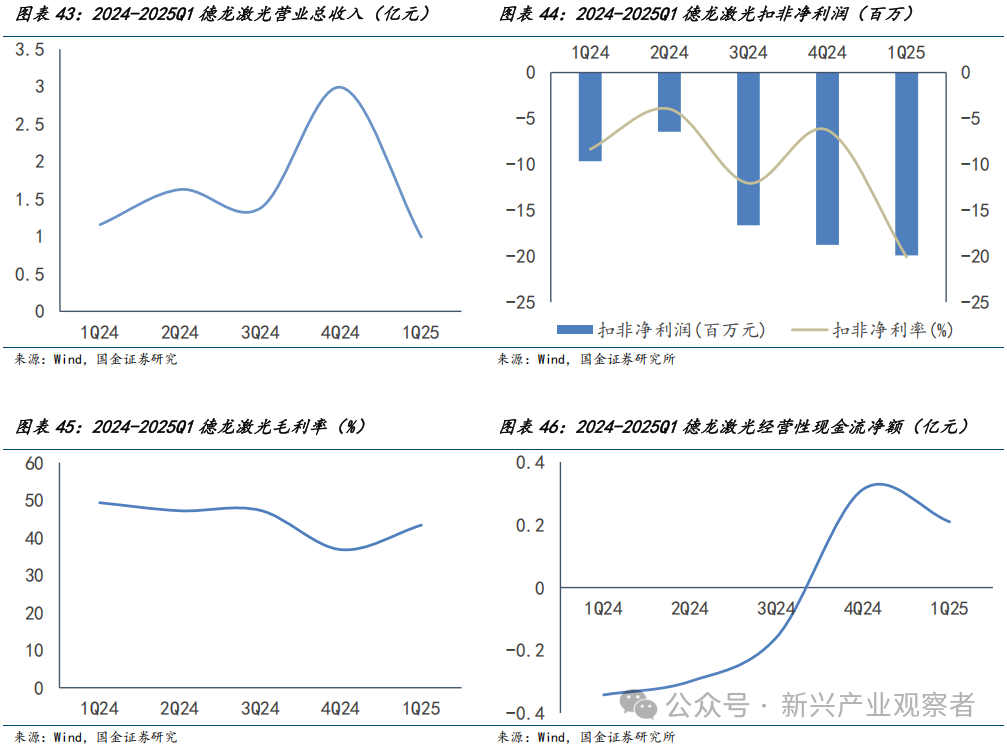 德龙激光营收营利短期下滑,毛利率逐步修复且现金流持续转正,在手订单为经营提供有力支撑。公司过去五个季度以来净利逐渐下降,至2025年Q1为亏损1991.7万元;经营现金流则在2024年第四季度转正,至2025年第一季度2094.3万元;营业收入在上年第四季度最高,达到3.0亿,今年一季度回落至1.0亿;毛利率25年第一季度小幅回升至43.3%。净利的负增长与营收的下滑主要肇因于公司于24年来专注于固态设备研发,加大科研投入,2024全年研发费用约1.7亿元、并且扩张科研人员总数,以及宁德时代等主要客户对固态设备的回款周期延长,使年初主营收入表现相较于年末不显著等因素。若固态设备验证、产业化顺利,将具较大利润弹性。