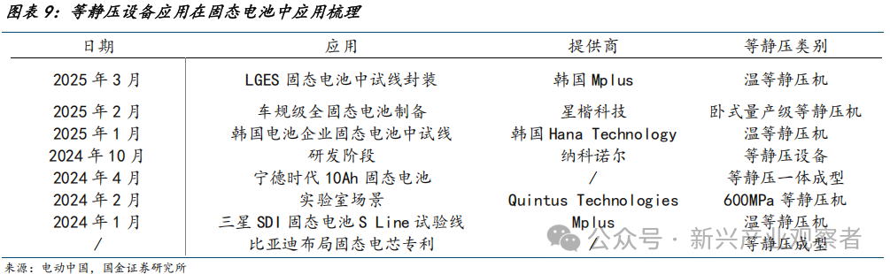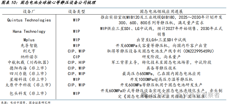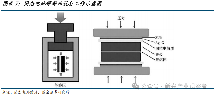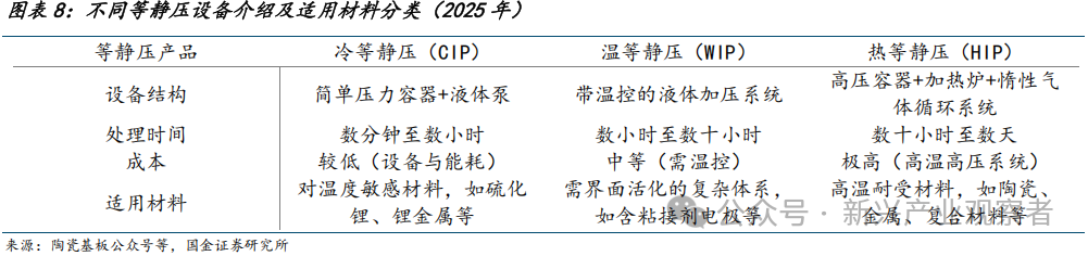 从工艺协同性看,CIP通常作为预处理步骤,为后续烧结提供致密生坯;HIP则常作为最终工序,直接实现材料的高性能化;WIP可作为中间工序,例如在CIP生坯基础上进一步优化界面,或在HIP前进行界面活化以缩短高温处理时间。结合现实情况看,由于当前HIP成本较高(千万至上亿元级),且硫化物体系整体耐高温性能较弱,目前行业以CIP为主,逐步过渡至WIP,未来HIP国产化率提升及成本下降后有望加大应用。