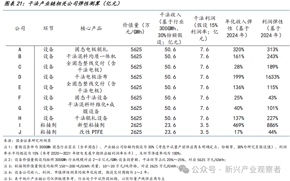 干法环节产业链布局公司&弹性测算:设备端以纳科诺尔、宏工科技、先导智能为代表,推动干法产业化;材料端东岳集团、海辰药业有望加速突破量产瓶颈。GGII预测2035年固态电池需求总量为300GWh(含半固态),考虑到固态电池设备及材料壁垒较高,测算假设设备及材料供应商份额为30%、利润率为15%,产业链公司收入弹性为17%~469%,及利润弹性为43%~1633%。