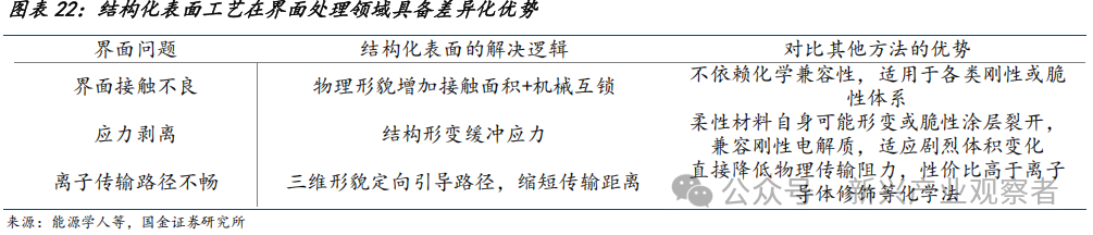 结构化表面与其他界面处理方法的核心差异在于:它通过物理几何形态重构从空间维度解决界面的固有矛盾,而其他方法多从材料属性优化或外部条件调控入手,适用于解决接触不良、应力剥离、离子传输路径不畅等问题。