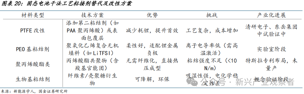 固态干法粘接剂格局:高端改性材料仍需进口,亟待国产替代。现有粘结剂体系的核心矛盾在于:传统粘结剂无法同时满足与硫化物电解质的化学兼容性、对硅体积膨胀的缓冲适应性、足够的机械支撑强度以及离子传导能力这四大关键需求。目前干法粘接剂以改性PTFE为主,一般表面碳包覆或化学结构优化;国内通过东岳集团、清研电子等加速追赶,但高端品仍依赖杜邦、大金等进口,工程化量产为核心瓶颈。