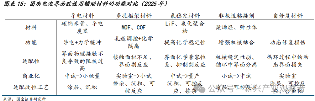 界面改性辅助材料:界面改性工艺中导电材料、多孔框架材料,及氟稳定材料等多见于辅助配套,均属于界面改性刚需,帮助解决离子传输、接触损失,及副反应等问题。导电材料如碳纳米管等及多孔MOF框架等通过增强离子传输与应力缓冲,在硫化物与聚合物体系中不可或缺;氟稳定材料和非极性粘接剂则分别解决硫化物的湿敏性及电极粘接等,为规模化的关键支撑。按照应用前景看,导电材料>氟稳定材料>非极性粘接剂>多孔框架材料>自修复材料;前三者已通过半固态电池规模化验证,成本可控,解决界面导电、化学稳定及机械应力等核心痛点;后两者技术潜力大,但量产工艺待突破,短期性价比有限。