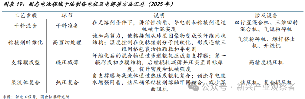 设备:粘接剂纤维化为核心环节,亟待工程化量产突破。粘接剂纤维化过程需同时满足纤维化的精准控制及连续生产要求:1. 剪切-温控:粘接剂需在临界剪切力+窄温度区间下原纤化,设备需同步精准调控剪切与温度;2. 干态物料分散:活性物质、导电剂、粘接剂密度及颗粒差异大,干混易分层,导致局部粘接不足或过量,需定制化分散技术;3. 连续化生产:混料、纤维化、成型等工序需连续化集成,任一环节波动都会导致新能偏差,目前规模化量产的协同控制技术仍未完全突破。