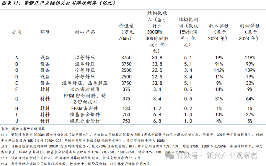 等静压环节产业链布局公司&弹性测算:设备端,先导智能、利元亨、纳科诺尔、璞泰来,及中航机载为国内温等静压、冷等静压潜在供应商;设备材料端,考虑温等静压,中密控股、唯万密封、东岳集团为密封环节潜在材料供应商,钢研高纳、久立特材为潜在镍基合金材料供应商。GGII预测2035年固态电池需求总量为300GWh(含半固态),考虑到固态电池设备及材料壁垒较高,测算假设设备及材料供应商份额为30%、利润率为15%,测算产业链公司收入弹性为1%~142%,及利润弹性为1%~139%。