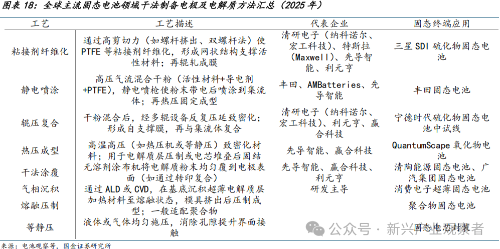 根据固态电池领域干法工艺的不同技术路径可分为:粘接剂纤维化、静电喷涂、辊压复合、热压成型、干法涂覆、气相沉积、熔融压制,以及等静压工艺等。针对固态电池不同电解质材料,干法的核心特点均在于通过无溶剂或少溶剂工艺,减少了界面副反应风险、溶剂残留和能量损耗,解决固固界面高阻抗、接触不良和循环失效等共性,然而本剧不同电解质类别所需干法技术路径不同: