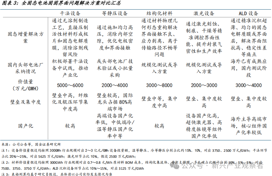 我们从应用前景确定性、壁垒及高附加值角度梳理具备投资价值细分赛道,推荐排序:干法设备、等静压设备、结构化材料、激光设备,及ALD等。从国产化程度看,干法设备、结构化材料已实现较高国产化程度,且已在头部电池厂实现规模化测试或推进产业化中;激光设备国产化高,但核心部件如超快激光器、高精度振镜等组件仍依赖进口,目前激光设备同样在下游头部客户规模化测试或中试线导入;等静压设备、ALD设备由海外主导,国产化率较低,目前在国内仍处于技术验证或小批量采购阶段,有待设备国产推动产业导入。从价值量看,我们根据固态电池设备投资额2~3亿元/GWh、材料BOM成本0.7~0.8元/Wh进行假设,同时假设干法、等静压、激光,及ALD在设备投资额中占比分别20%~25%、10%~15%、10%,及10%~15%,此外假设结构化材料在材料BOM成本中占比5%~10%,测算干法、等静压、激光、ALD,及结构化材料价值量预计分别5000~6000、2000~4000、2000~3000、3000~4000,及3000~8000万元/GWh。按照壁垒排序,ALD设备、激光设备、等静压设备壁垒较高,且集中度较高;结构化材料、干法设备壁垒中高,高技术壁垒环节集中度高。