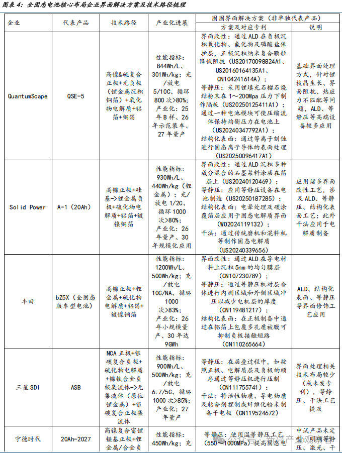 核心大厂固-固界面解决方案探讨:海外应用高端设备,国内擅长技术创新。从发展趋势看,海外企业布局更早,头部已进入中试-小批量生产阶段,界面处理中广泛应用ALD、等静压等高端处理技术,如QuantumScape、Solid power、丰田及三星SDI等均采用ALD进行界面改性等,工艺成熟度高但成本制约明显。国内企业目前处于小试-中试阶段,优先以干法、界面改性,及结构化材料等性价比优势技术方案推动固态电池中试线量产,整体高端设备尚处于应用早期。