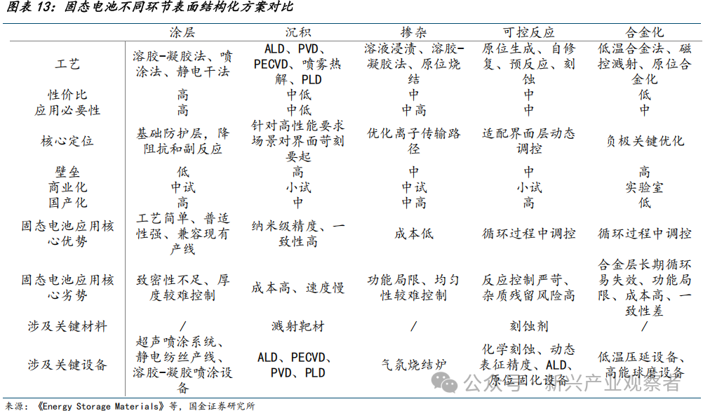 综上,我们按照固态电池界面改性技术发展前景排序:涂层>掺杂>沉积>可控反应>合金化,涂层法、掺杂法,及沉积法或具备较好应用前景。涂层工艺成熟且成本可控,是当前产业化的主要选择,能平衡界面性能与量产需求。掺杂作为辅助方式,通过缺陷调控优化局部性能,多用于提升电导率,与其他方法配合使用。沉积具有原子级一致性与稳定性,适用于高端场景的苛刻界面,可有效解决阻抗与兼容性问题。可控反应以原位反应为主,为半固态核心增量工艺,且适配聚合物体系,全固态应用有限。合金化存在体积膨胀与高阻抗问题,应用范围较窄,仅在特定体系中作为补充方向。