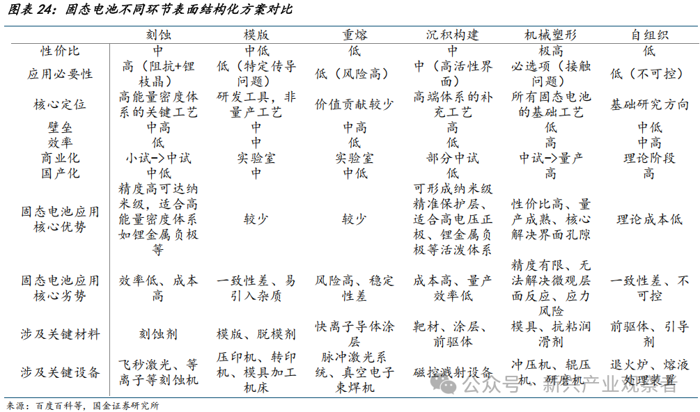 综上,我们按照固态电池结构化表面技术发展前景排序:机械塑形>刻蚀>沉积构建>模版>自组织>重熔,机械塑形法、刻蚀法,及沉积构建法或具备较好发展前景。固态电池结构化表面技术的核心竞争将聚焦于机械塑形和刻蚀:机械塑形是普适性基础工艺,凭借低成本和高兼容性成为优选项;刻蚀是高能量密度体系的关键突破点,解决阻抗和枝晶难题,商业化进度领先;沉积构建作为补充方案,在特定高活性体系中发挥价值。其他技术如模版法、自组织、重熔等因性价比低或效果差,难以进入量产阶段。
