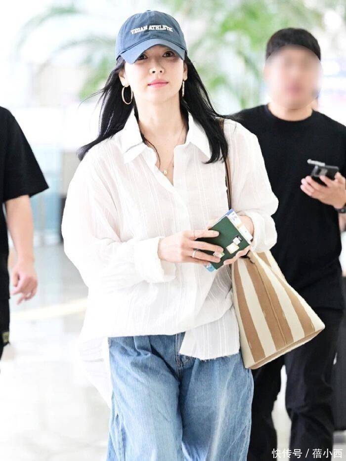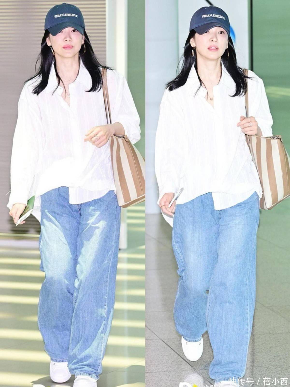 机场通勤的时候,她最爱穿白衬衫+阔腿牛仔裤,看着简单却很有气场。白衬衫的宽松版型能柔和肩线,解开两颗扣子,露出一点锁骨,多了几分呼吸感,竖条纹还能纵向拉长身形,显得人更挺拔。下身搭一条浅蓝色阔腿牛仔裤,高腰设计把腰线抬得高高的,裤腿垂坠感特别好,能完美遮住小腿肌肉和胯部的肉肉,不管是O型腿还是X型腿,都能藏得好好的。