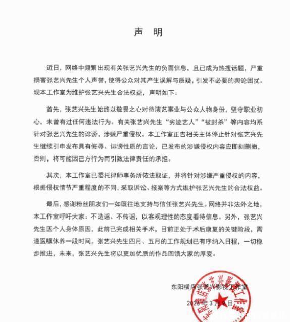 但是重点来了!工作室的声明,全程没提“国家话剧院”,也没回应“暂停一年线下演出审批”这事儿,只解释说,最近张艺兴活动变少,是因为1月份做了鼻中隔偏曲手术,术后需要休养,还说4-5月的工作规划都正常推进,这波操作,直接被理记抓住把柄!
