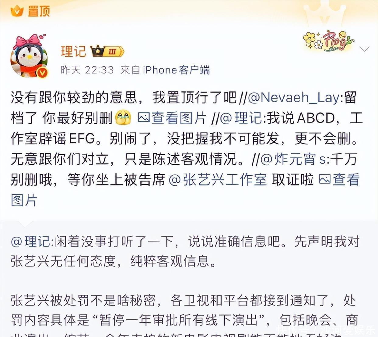 理记直接硬刚回去,说自己的爆料是客观陈述,还指责张艺兴工作室避重就轻,问的是ABCD,回应的是EFG,根本没敢碰“国话纠纷”的核心,甚至还把自己的爆料原文置顶,放话“欢迎取证”,一副胸有成竹、没把握不发的样子,还拒绝了粉丝让他删帖的要求。