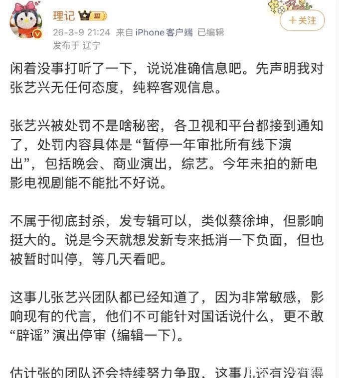 有粉丝举证,张艺兴2026年1月还参与了中巴建交的活动,2月份还担任了联合国春晚的主持,3月份还有作品登上央视,而且国家话剧院的官网上,至今还显示张艺兴是话剧《受到召唤·敦煌》的主演,这跟理记说的“暂停所有线下演出”“被封杀”,完全矛盾啊!